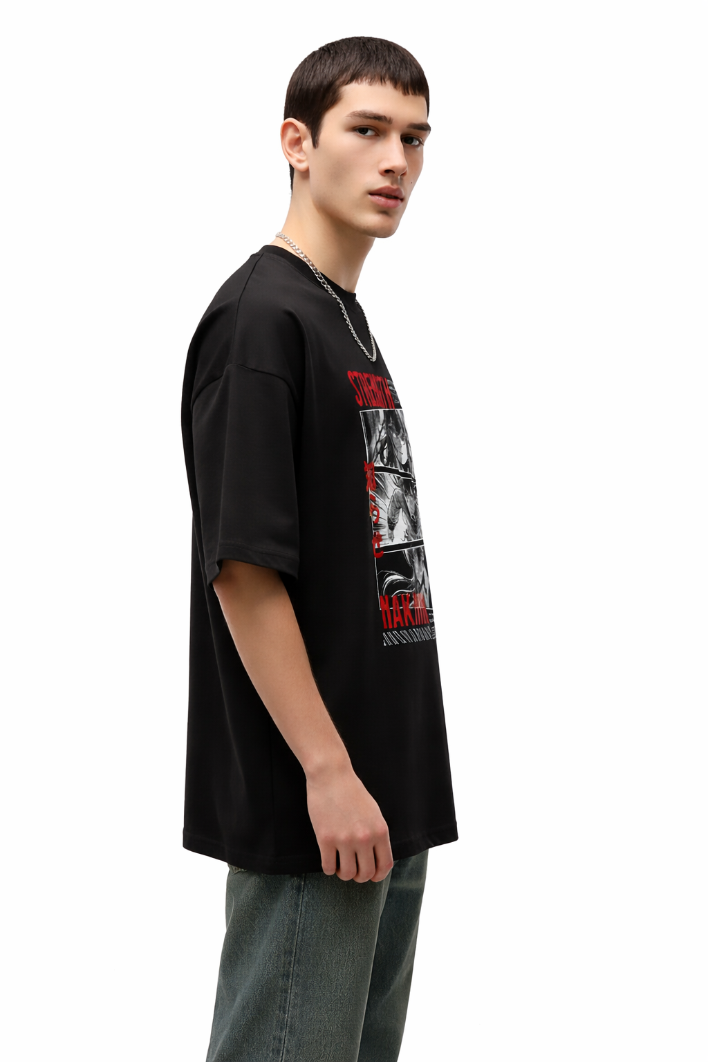 Make a bold streetwear statement with this oversized black anime graphic t-shirt, designed for comfort and standout style.
