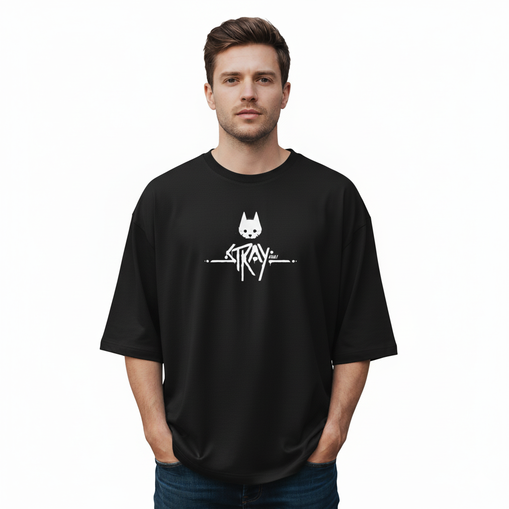 "സ്ട്രേ" തീമിൽ നിന്ന് പ്രചോദനം ഉൾക്കൊണ്ട് ബോൾഡും മിനിമലിസ്റ്റുമായ ഒരു പൂച്ച ഡിസൈൻ ഉൾക്കൊള്ളുന്ന ഈ വലിയ കറുത്ത ടീ-ഷർട്ട് ഉപയോഗിച്ച് നിങ്ങളുടെ തെരുവ് വസ്ത്ര ശൈലി മെച്ചപ്പെടുത്തൂ.
